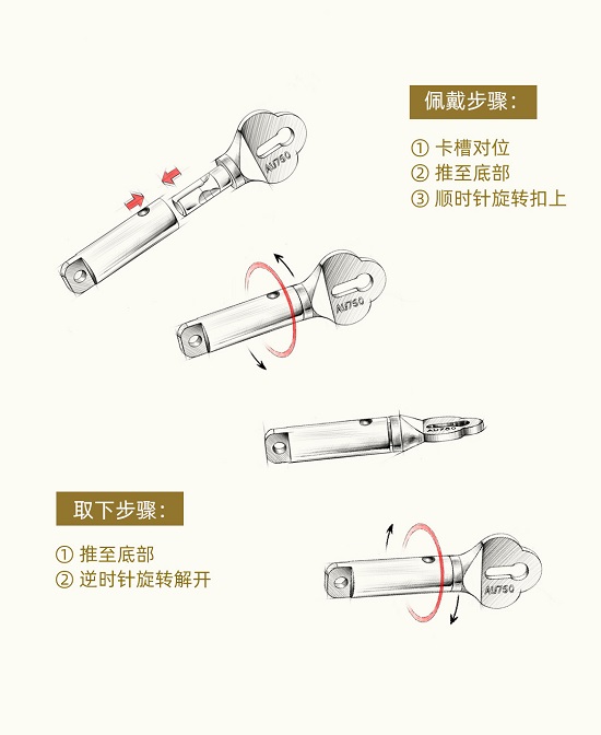 同心扣采用全新旋式结构,佩戴时插柱与卡槽能“同心结合”,自成一体,简约美观。